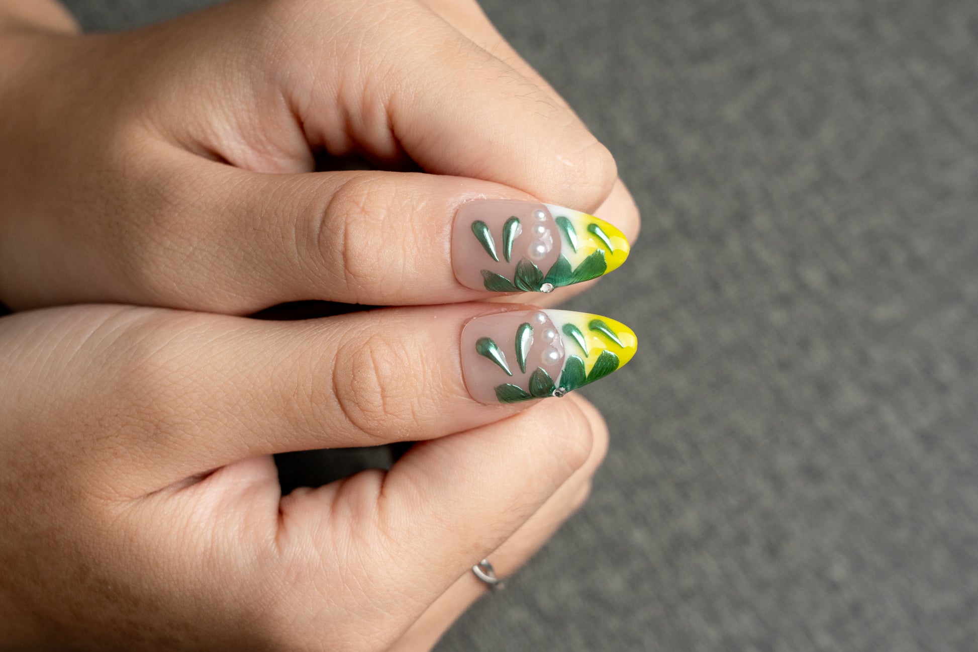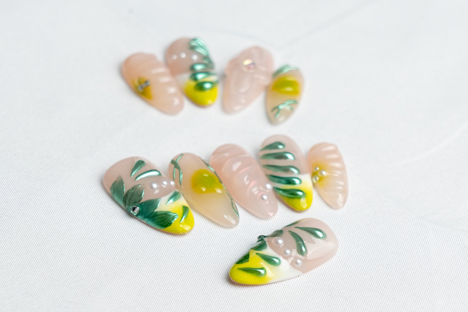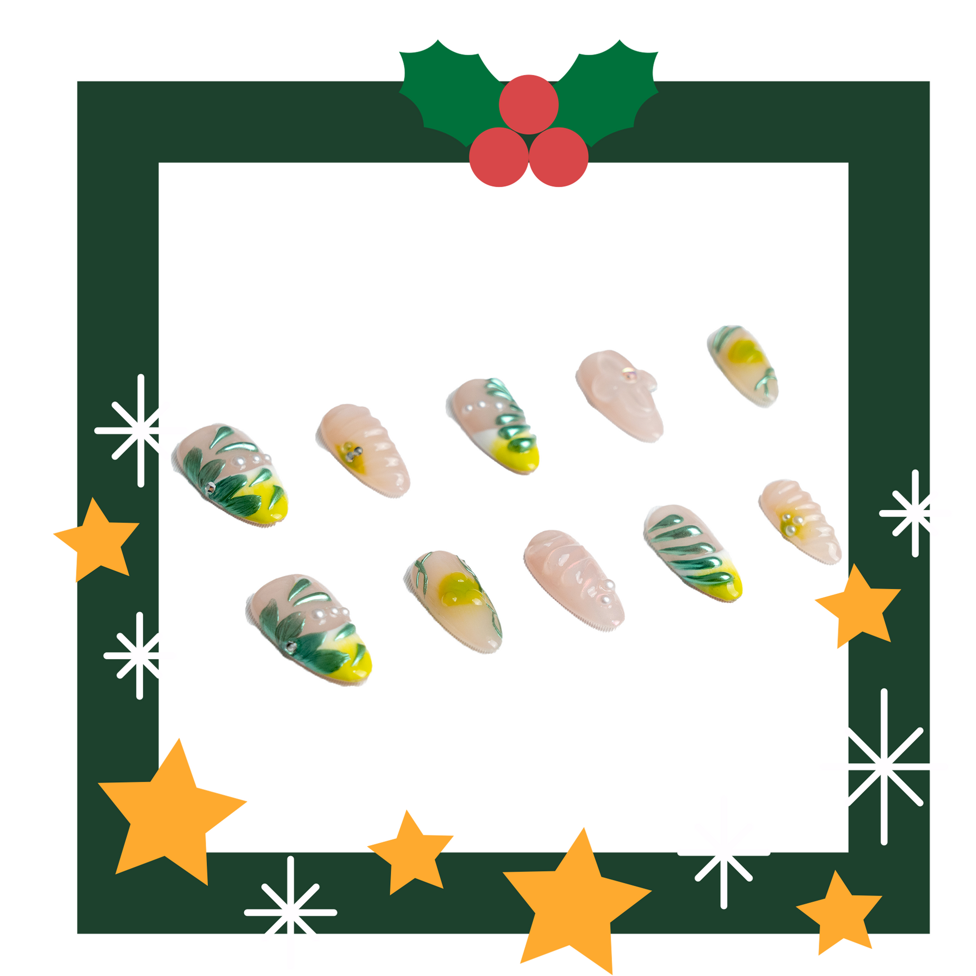 Bring a fresh breeze to the holiday season! Our "Lemon Story" press-on nails feature a soft nude base adorned with vibrant green leaves and sunny yellow lemons, as if a Southern French orchard is blooming at your fingertips. Delicately placed tiny diamonds sparkle like morning dew, adding a unique touch of freshness and playfulness to your festive look.