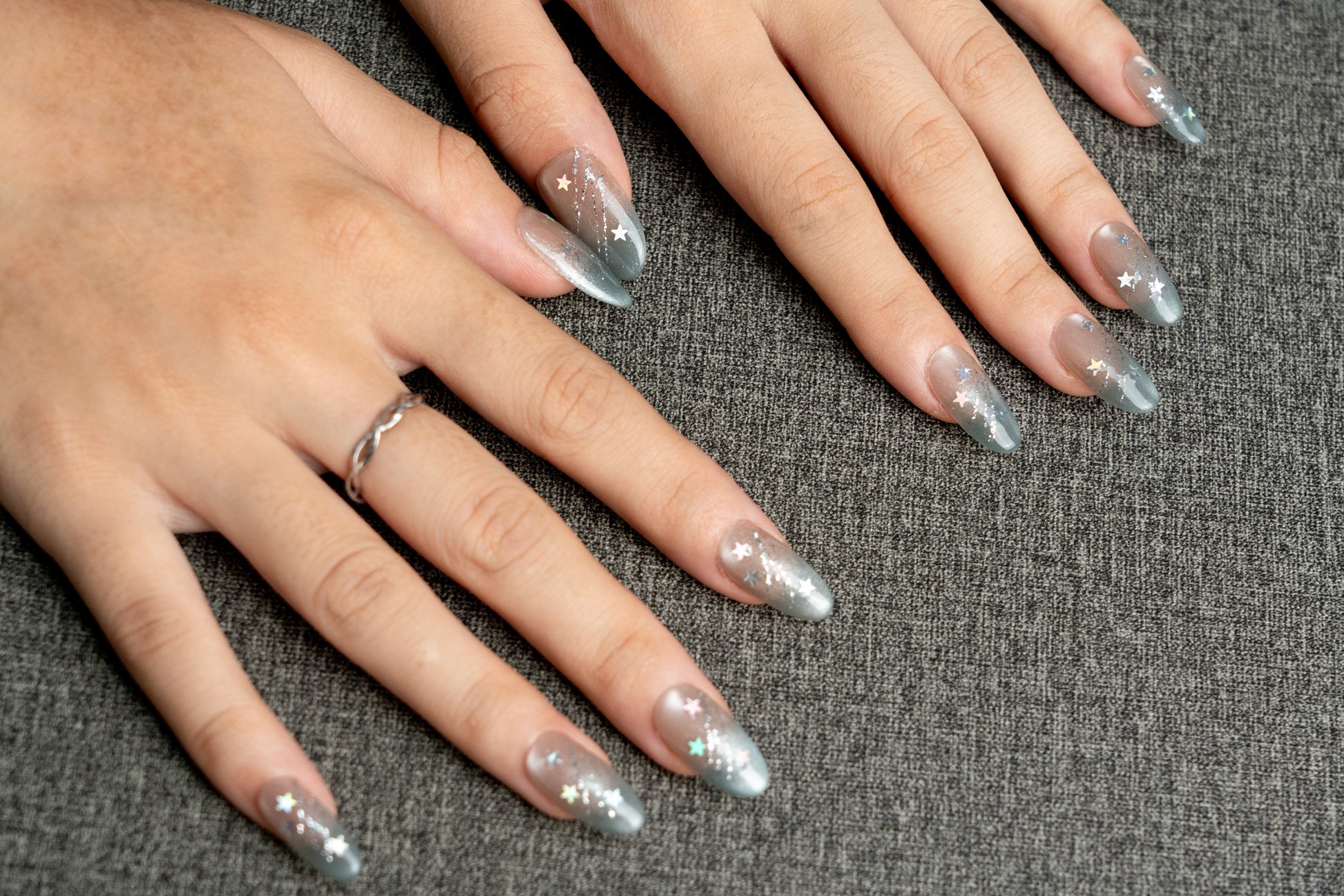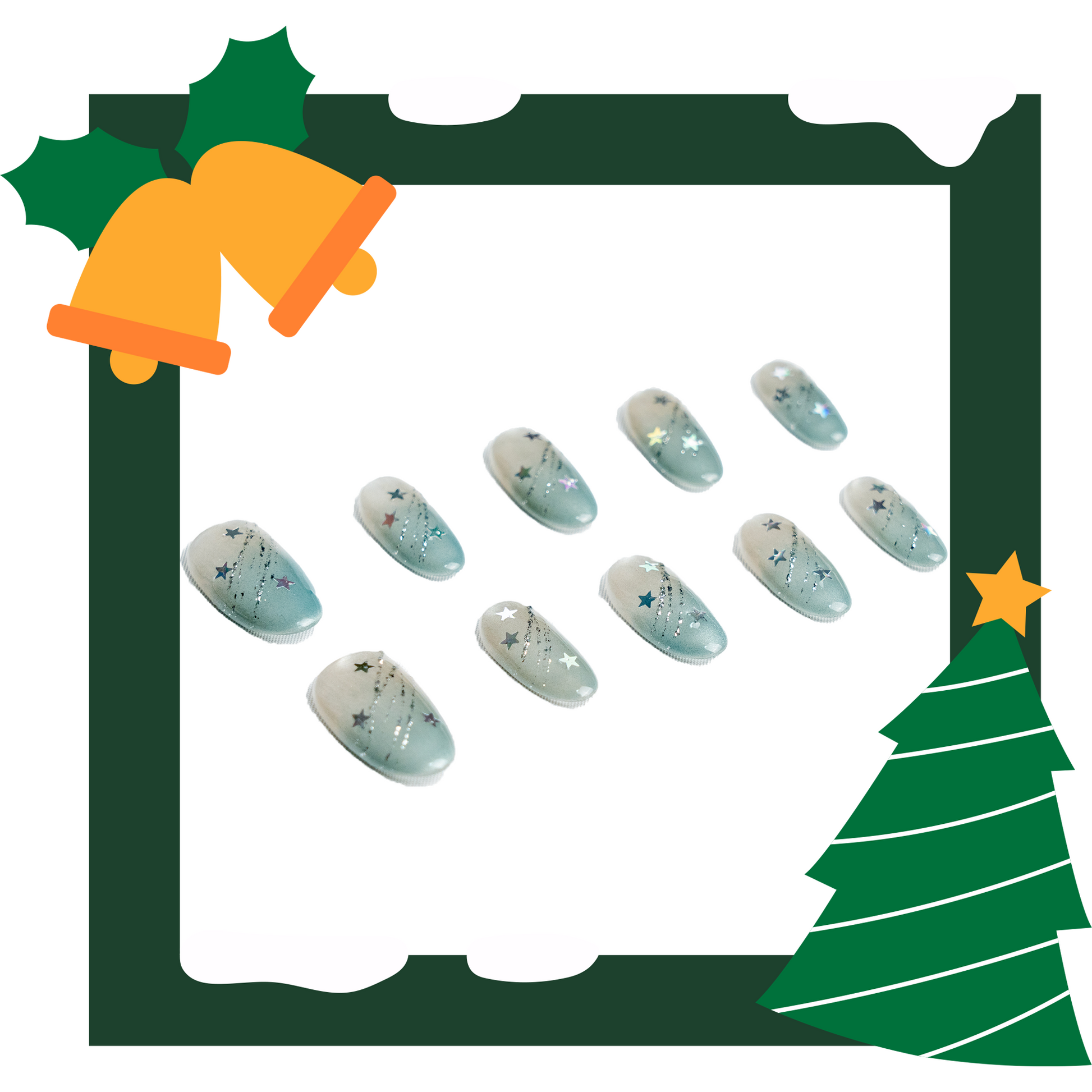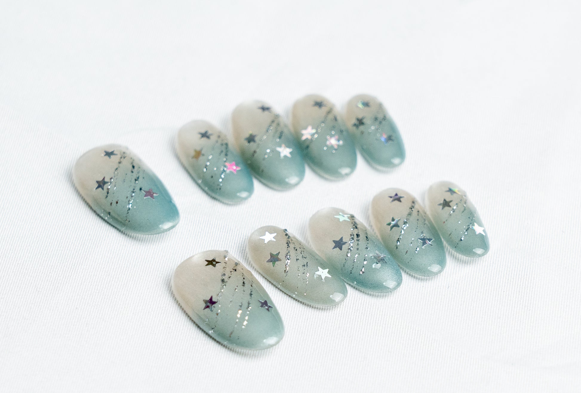 “Starlit Winter Wish” press-on nails feature a soft gradient of misty teal and creamy snow-white, delicately accented with silver glitter trails and holographic star embellishments—resembling Christmas meteors streaking across a serene winter sky.